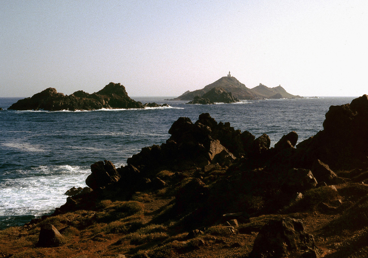 Archipel des Sanguinaires. Grande Sanguinaire (mit Leuchtturm) besteht aus dunkelrotem Porphyr die anderen Inseln