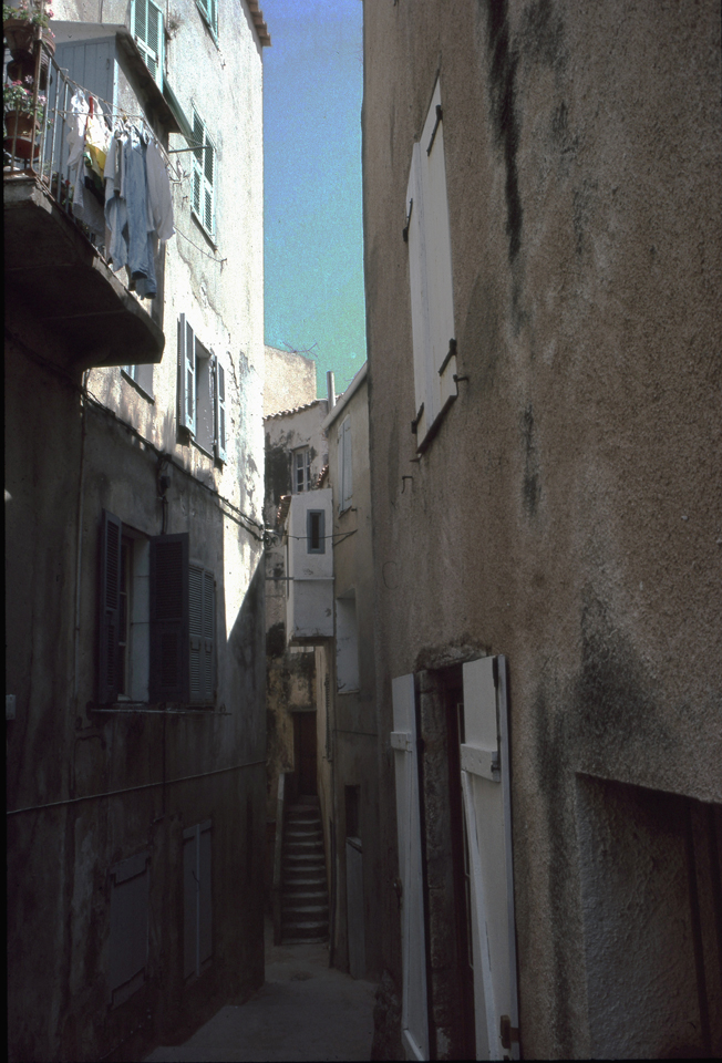 Sehr enge, verwinkelte Gassen, flankiert von schmalen Hochhäusern, führen über sehr steile Treppen,