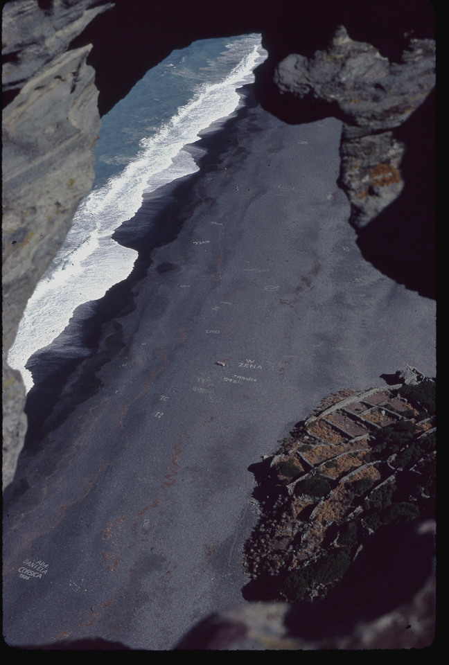 Der Strand besteht nur zum Teil aus dem, noch vorhandenen, angeschwemmten groben Gestein des Schiefer- und Asbestabbaus