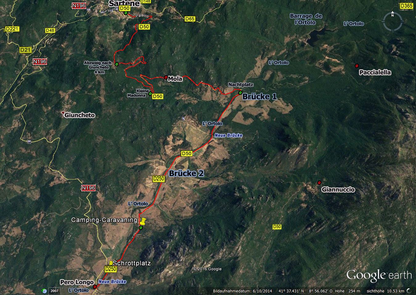 von Sartène über den Col de Suara nach Mola, sind es 12km. Von Mola zur L'Ortolo-Brücke (Nachtlager) 4km.