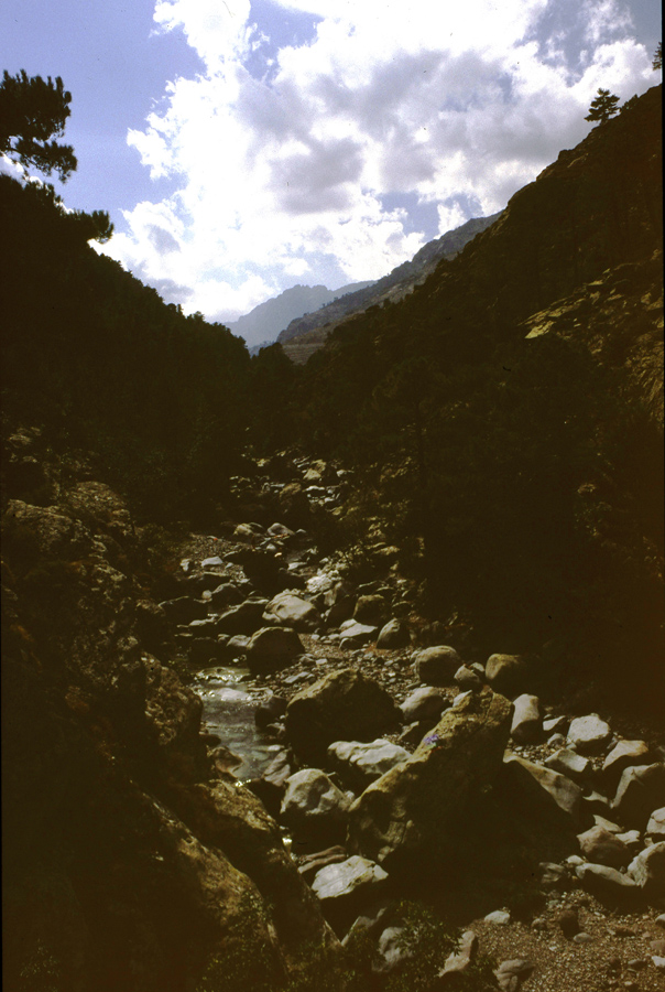 Vom Nachtlager am Tassinetta-Bach geht es hier über den Wildbach Stranziacone auf die D147 zum Cinto-Aufstieg. Jahr 1986