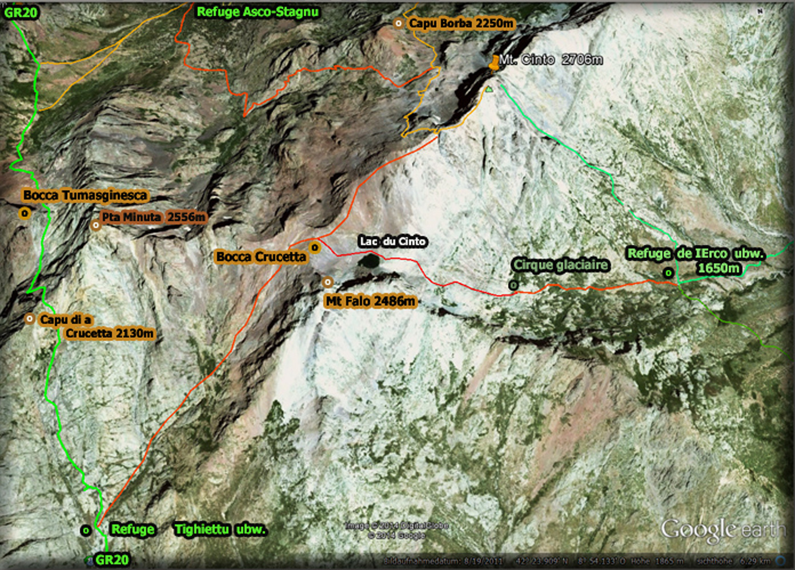 Abschluß-Karte Monte Cinto. Das 'ubw.' bei den Refuges bedeutet: unbewirtschaftet.